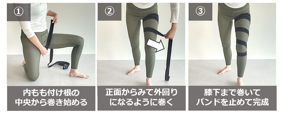 ②太ももで外回り方向に3~4周巻きます。