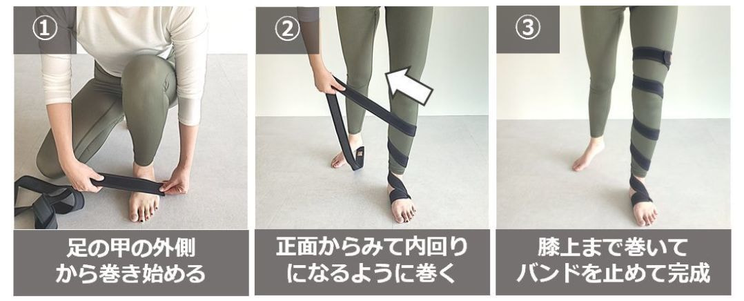 ①足の甲から巻き始め、膝の捻じれを取るために内回りで巻いていきます。