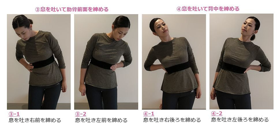 ②息を吐いて肋骨を軽く締めた状態をつくりバンドを止めます。